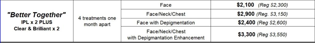 IPL PhotoFacial x 2 Clear+Brilliant x 2 A perfect combination of treatments to address sun damage, collagen stimulation, skin brightening, pore tightening and skin texture.
